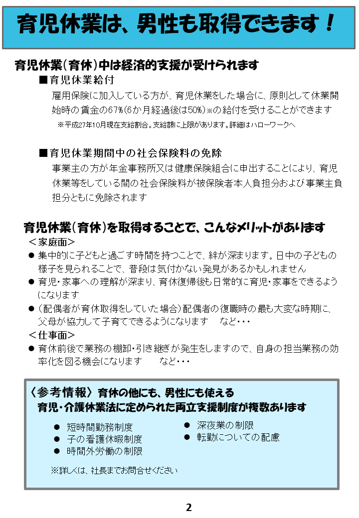 2018年6月20日、一般事業主行動計画(子育て支援行動計画)の目標2(産前産後休業や育児休業、育児休業給付、育児中の社会保険料免除など制度の周知や情報提供を行う)の対策実施の周知を行いました。