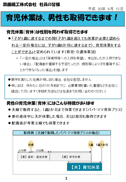 2018年6月12日、一般事業主行動計画(子育て支援行動計画)の目標1(男性育児休業取得を促進するための措置に実施、制度の周知や情報提供を行う)の対策実施の周知を行いました。